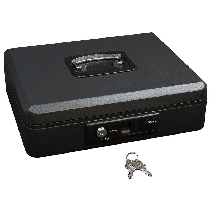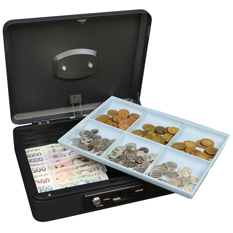 Blagajnička iz jeklene je opremljena z zunanjim kolenčkom za udobno avtomatsko odpiranje pokrova. Po zaprtju se pokrov avtomatsko zaklene, kar omogoča varno prenašanje, brez potrebe po zaklepanju s ključem.