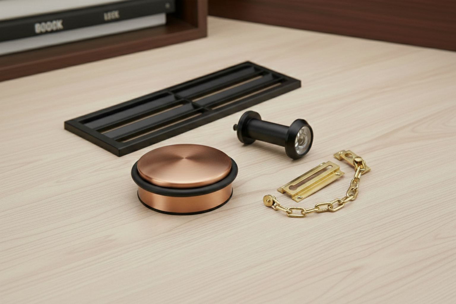 Pri izbiri dodatkov se držite pravila enotnega sloga. Če imate kljuke v izvedbi „mat črna“, naj bodo tudi omejevalnik, kukalo in tablica z imenom v istem dekorju. V naši spletni trgovini boste našli široko paleto površinskih obdelav, ki se bodo med seboj popolnoma ujele.