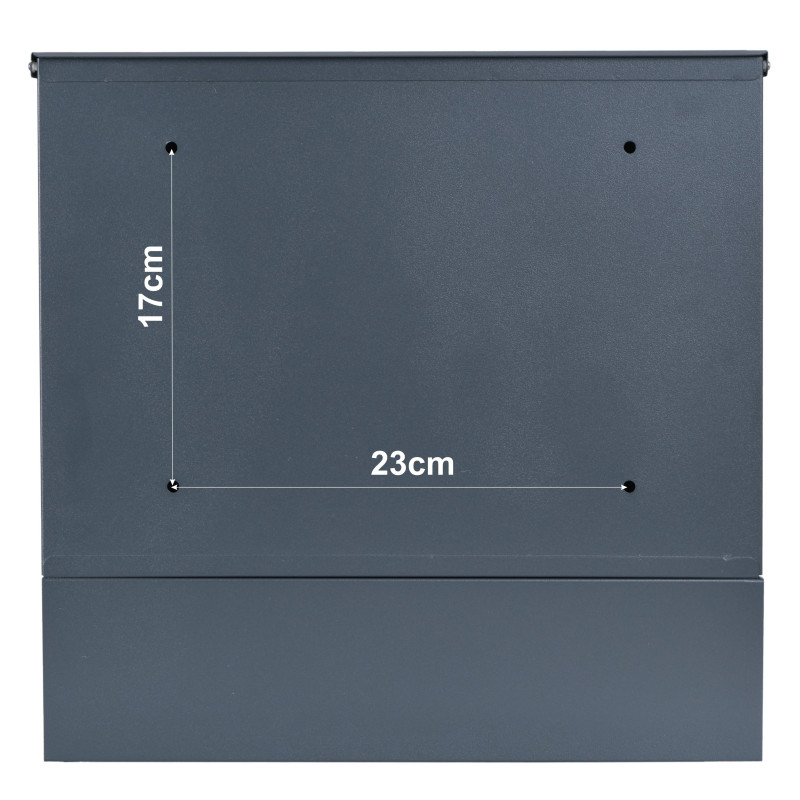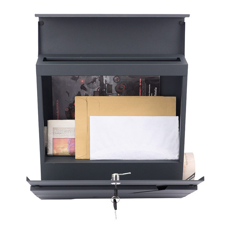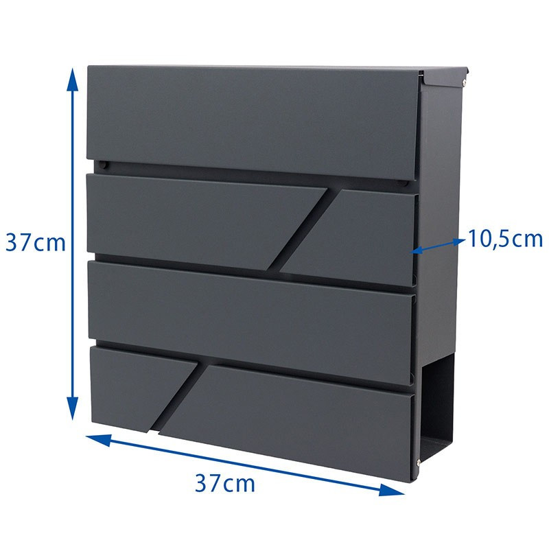 Kakovostno poštno nabiralnik iz pocinkane pločevine s prašnim premazom. Oblikovan je z mislijo na udobje uporabnika in trenutne estetske trende. Opremljen je s dodatnim predelkom za časopise in večje letake. Zgornji pokrov nabiralnika ščiti pošto pred vlago. Komplet vsebuje montažne vijake, pripravljene luknje na zadnji strani nabiralnika - za hitro in enostavno montažo. **Tehnične specifikacije:** - Dimenzije 37x37x10,5 cm / Š x V x G - Velikost odprtine za pošto: 33,5 x 3,5 cm / Š x V - Velikost cevka za časopise: 8x9 cm / V x Š - Velikost prostora za pošto: 36,5x26x8 cm / Š x V x G - Material: pocinkana pločevina s prašnim premazom - Barva: antracit RAL7016 - Enostavna namestitev - Namestitev znotraj in zunaj - Nabiralnik se zaklene, ključavnica je dobro zaščitena pred vremenskimi vplivi - Teža 3,5 kg - Vsebuje 2 ključa in montažne vijake (4 kosi) - Prostor za časopise in letake - Za montažo na ograjo lahko uporabite [držalo za nabiralnike](https://www.klucka.sk/nd-schranok/montazny-drziak-na-schranky-22-272cm-antracit-1846.html) Spoštovani kupec, pred nakupom se prosimo seznanite z dimenzijami nabiralnika. Dimenzije nabiralnika so navedene v tehničnih specifikacijah ali risbi - slikah. V ceno je vključeno: Poštni nabiralnik, 2 ključa, 4 montažni vijaki, 4 gumijaste podložke, kartonska embalaža.