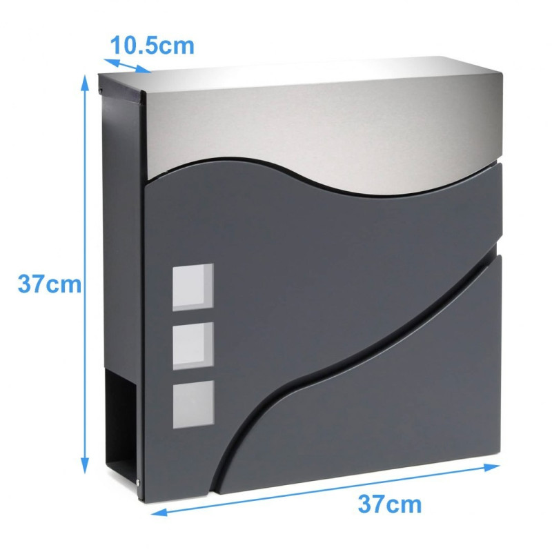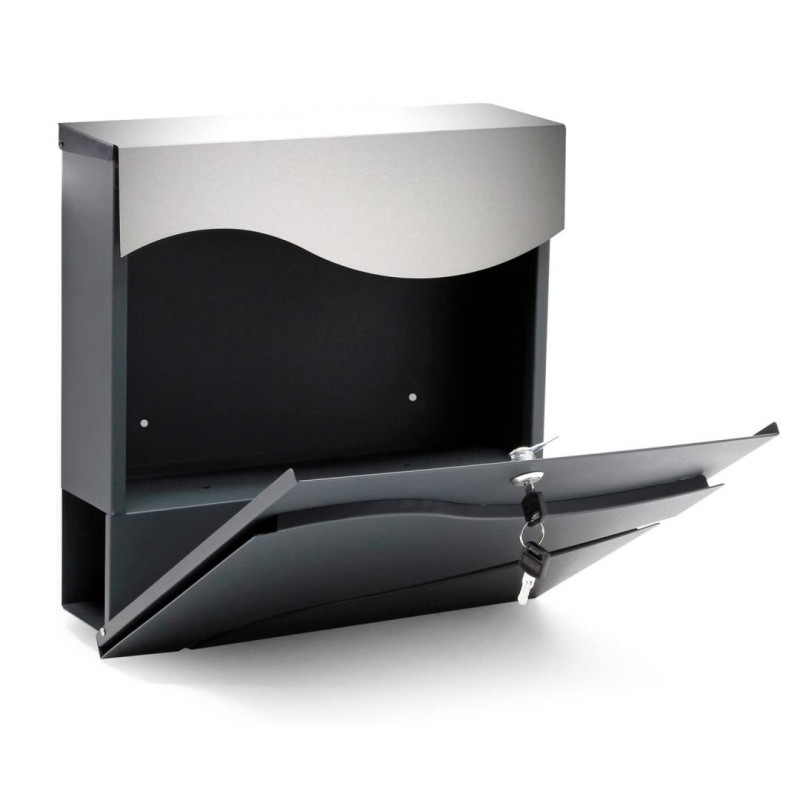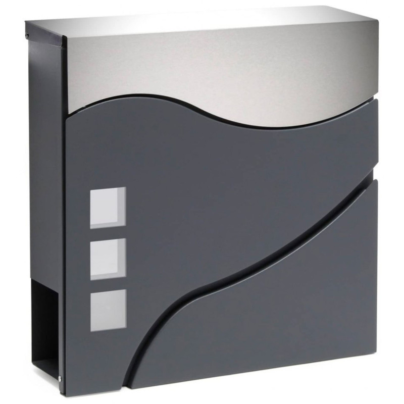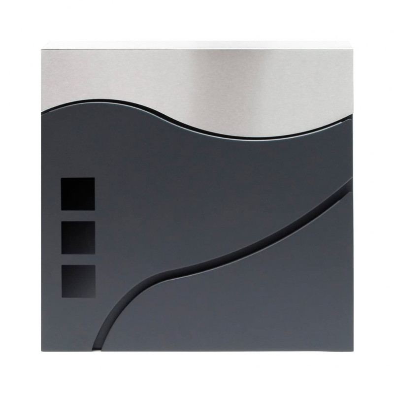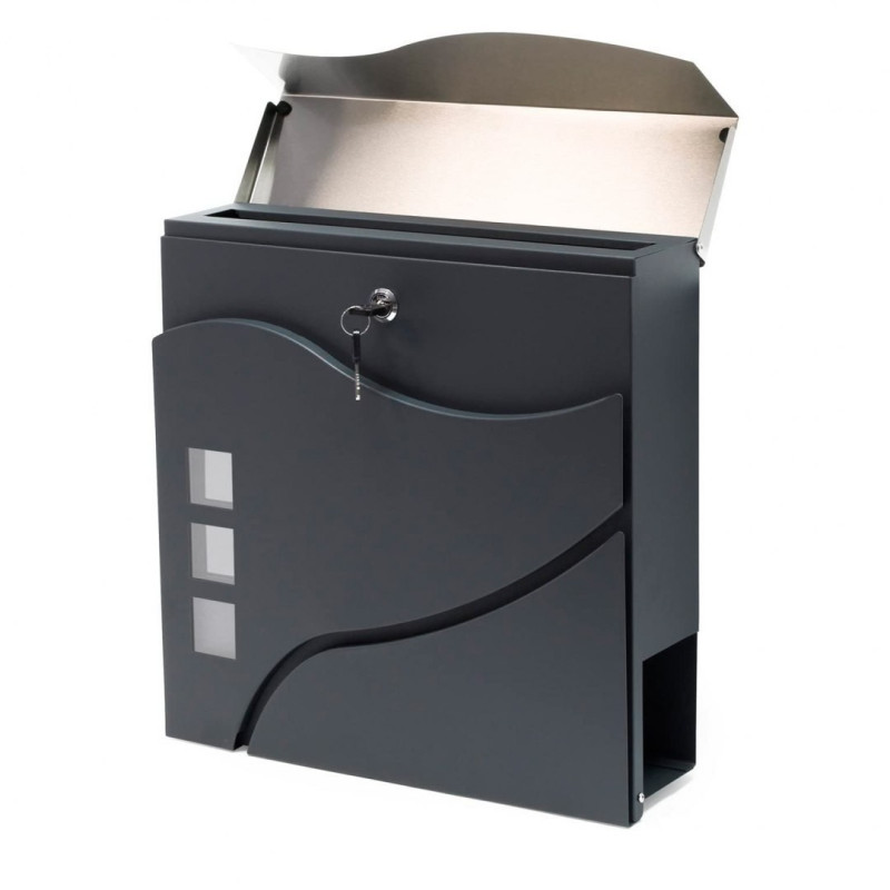 Moderna zasnova in brezčasen slog v kombinaciji antracita in nerjavečega jekla. Izdelan je iz materialov, odpornih proti vremenskim vplivom. Zasnovan je bil za udobje uporabnika z okenci za prepoznavo prejete pošte. Vsebuje dodatni predal za časopise in večje letake. Zgornji pokrov nabiralnika zelo dobro ščiti pošto in ključavnico pred vlago in dežjem. Set vsebuje montažne vijake, odprtine pa so pripravljene na zadnji strani nabiralnika – za hitro in enostavno montažo.
