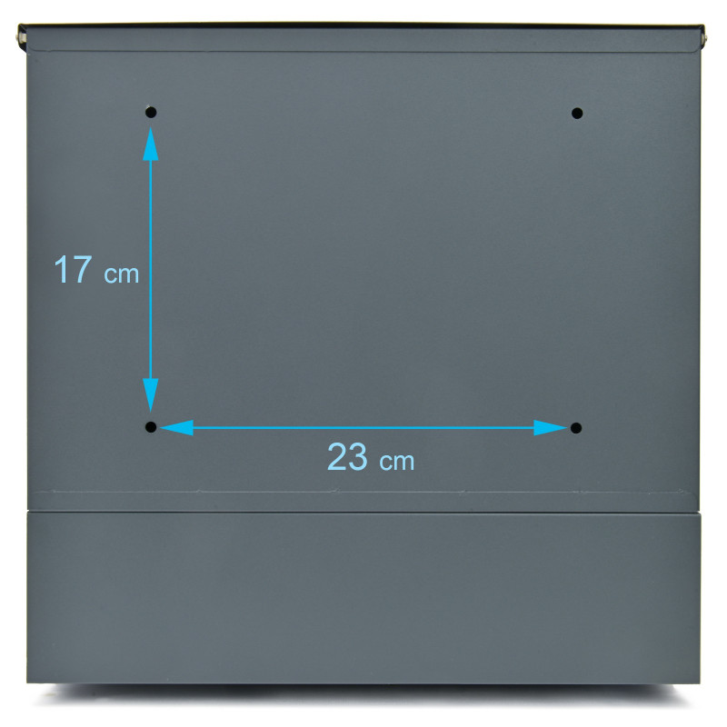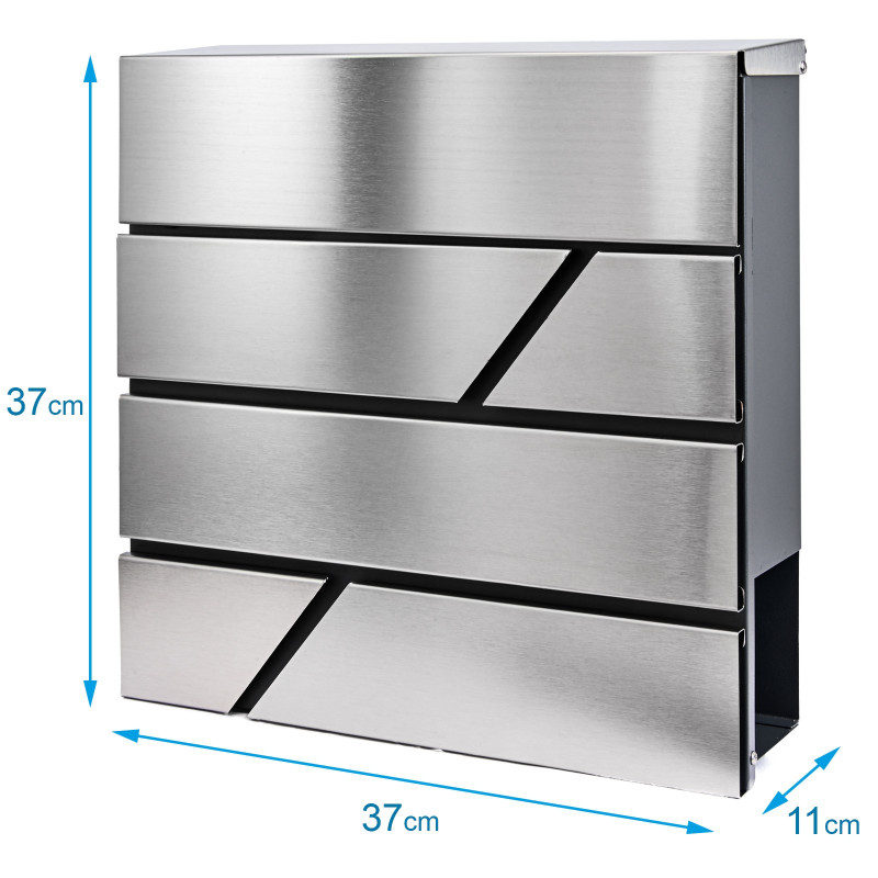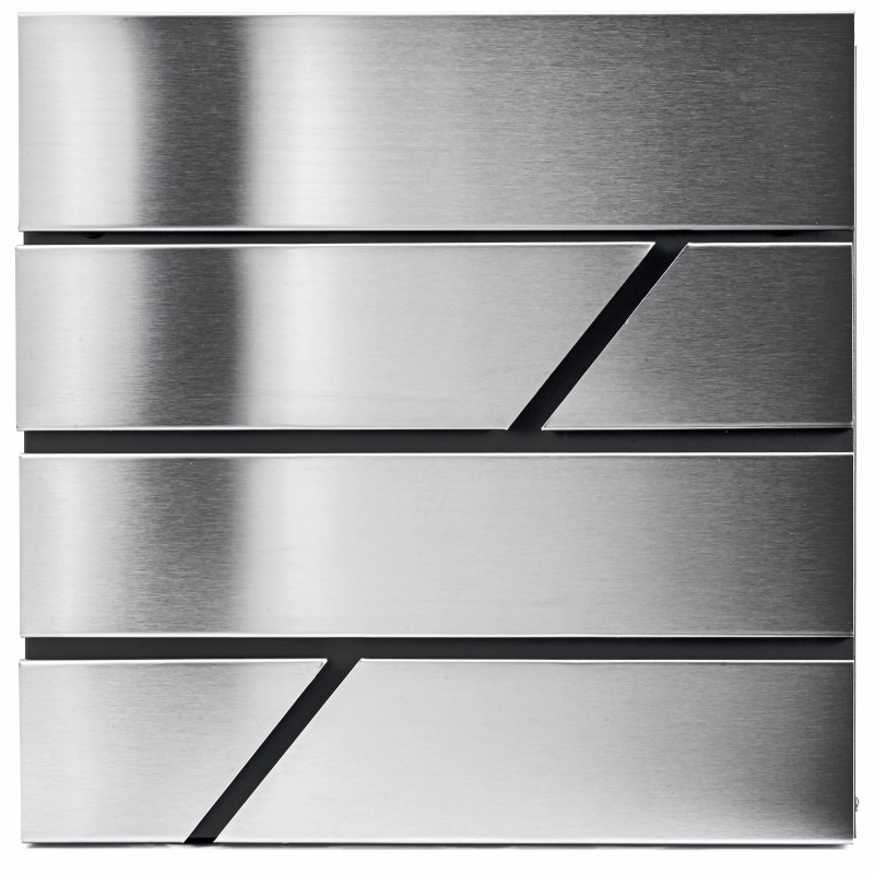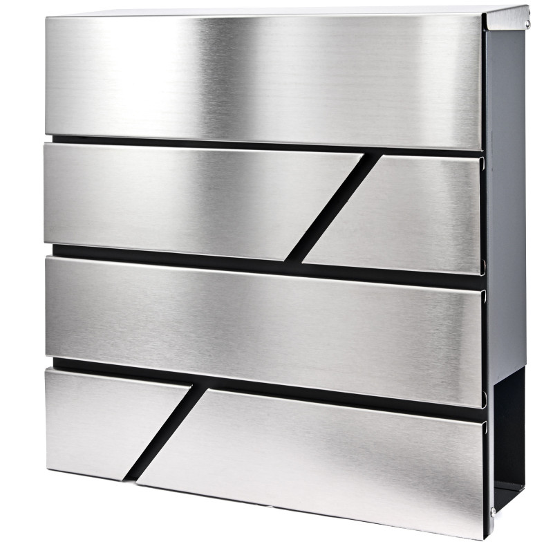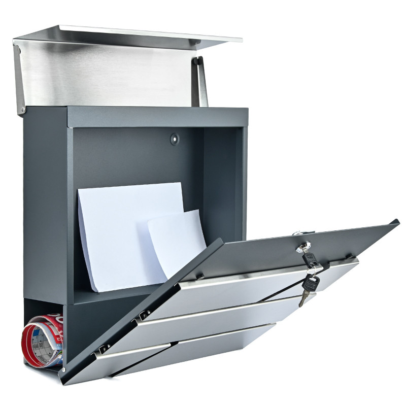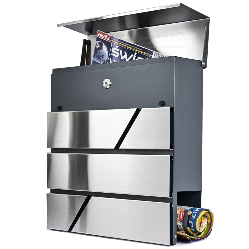 Poštni nabiralnik z kombiniranim površjem - nerjaveče jeklo in antracit. Zaradi uporabe ustreznega materiala je nabiralnik odporen na vremenske razmere. Oblikovan je bil za udobje uporabnika in upošteva sodobne estetske trende. Opremljen je z spodnjim cevastim odsekom za časopise in večje letake. Zgoraj je vsa pošta dobro zaščitena pred vlago in dežjem. Barvna kombinacija nerjavečega jekla in antracita.