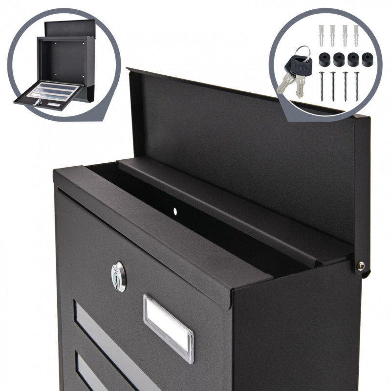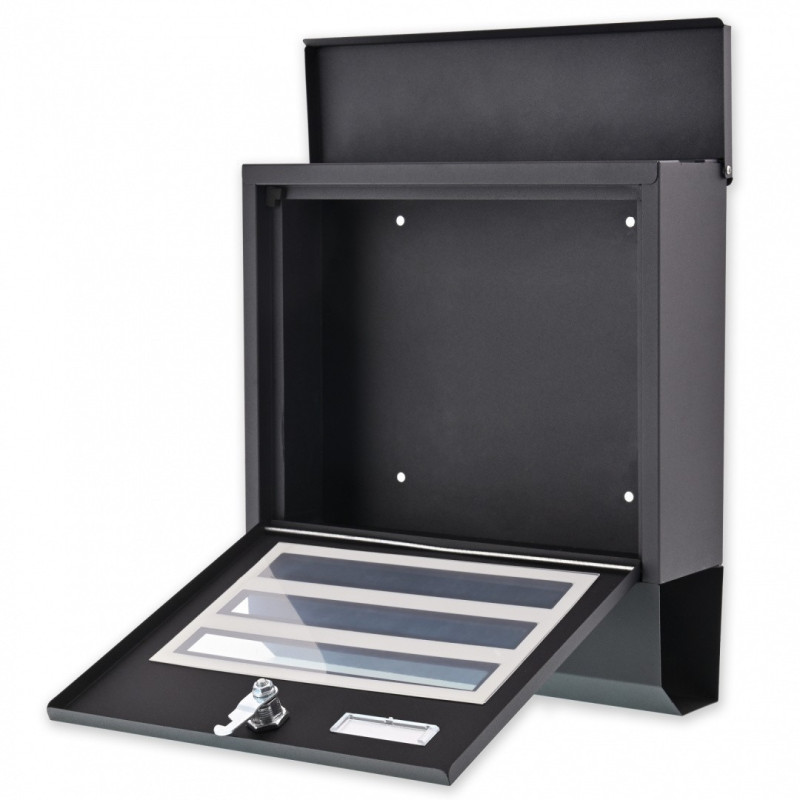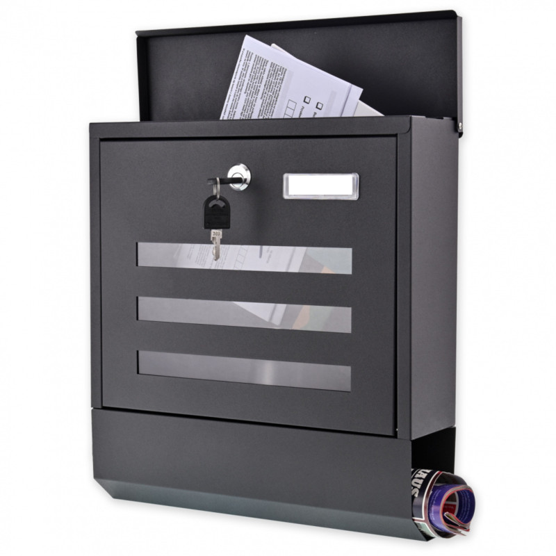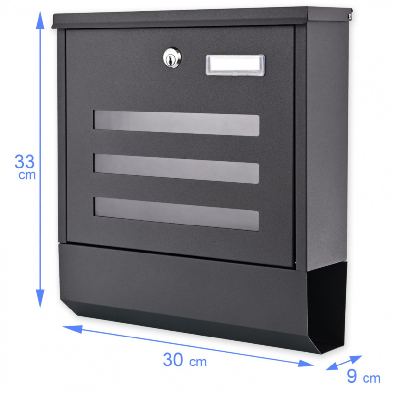 Kakovostno poštno nabiralnik iz jeklene pločevine v črni barvi. Uporabnikom nudi udobje zahvaljujoč 3 oblikovanim podolžnim oknom z možnostjo pregleda notranjosti nabiralnika. Ta funkcija omogoča preverjanje vsebine nabiralnika brez potrebe po vsakokratnem odpiranju. Preprosto preverite sprednji del in ne pozabite prevzeti svoje pošte. Nabiralnik je opremljen s spodnjim tubusom za časopise in letake (pogosto tiskane v večjem formatu).