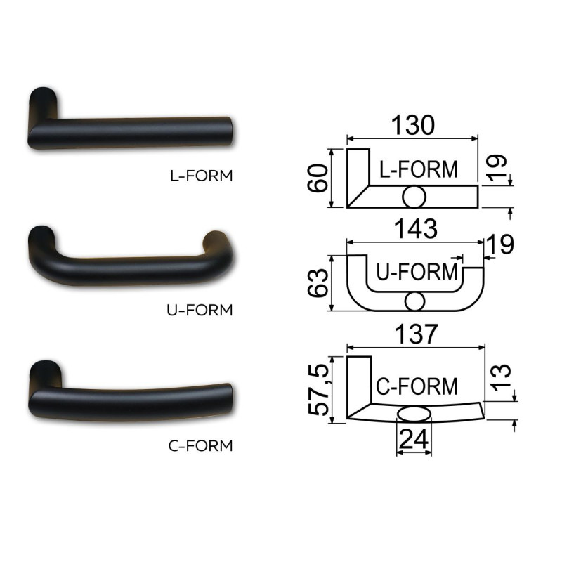 • Standardna kljuka v obliki "C-FORMA" - na zahtevo možnost izvedbe L-FORMA ali U-FORMA (prosimo, navedite v opombi ob naročilu).