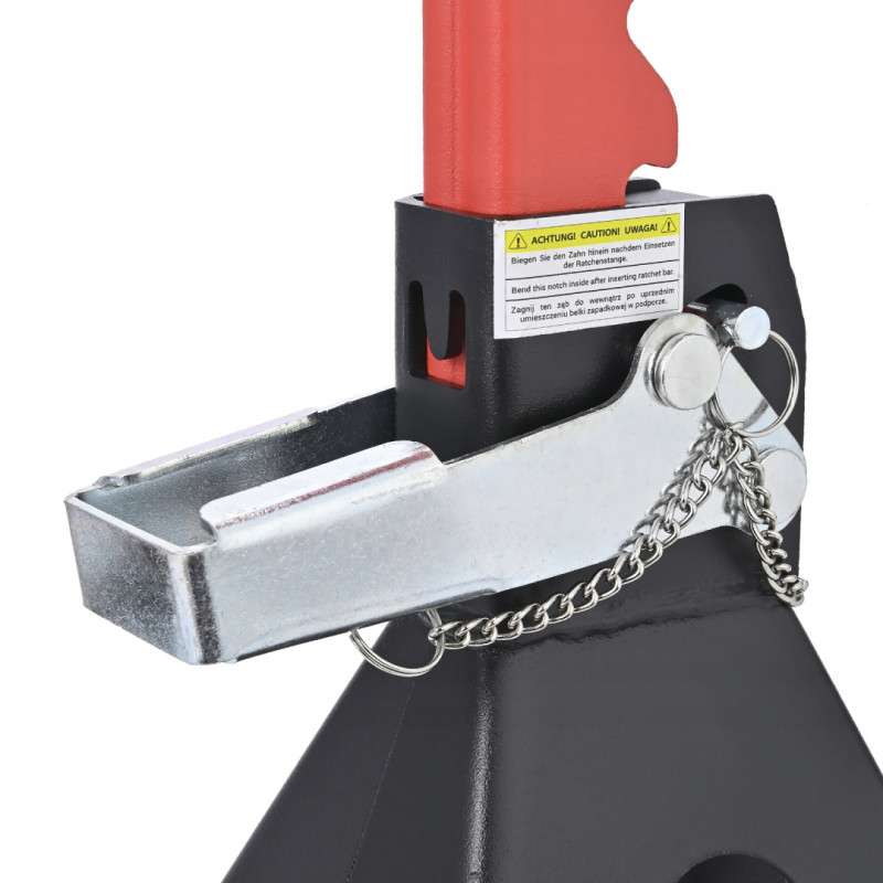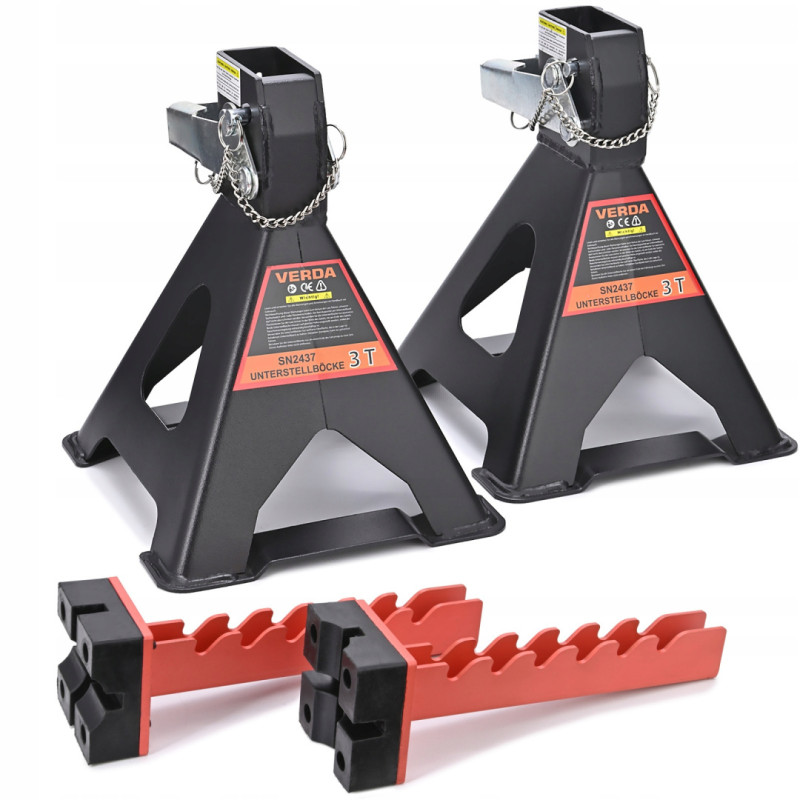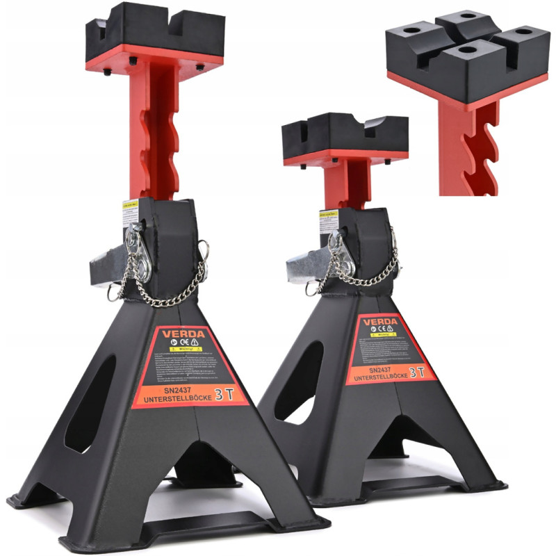 Komplet dveh stojalov s nosilnostjo 3 tone, s varnostnim zatičem. Vključena je tudi velika zaščitna guma.