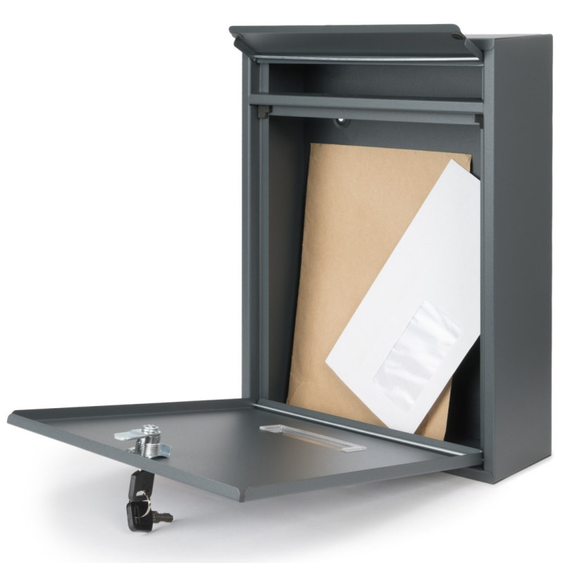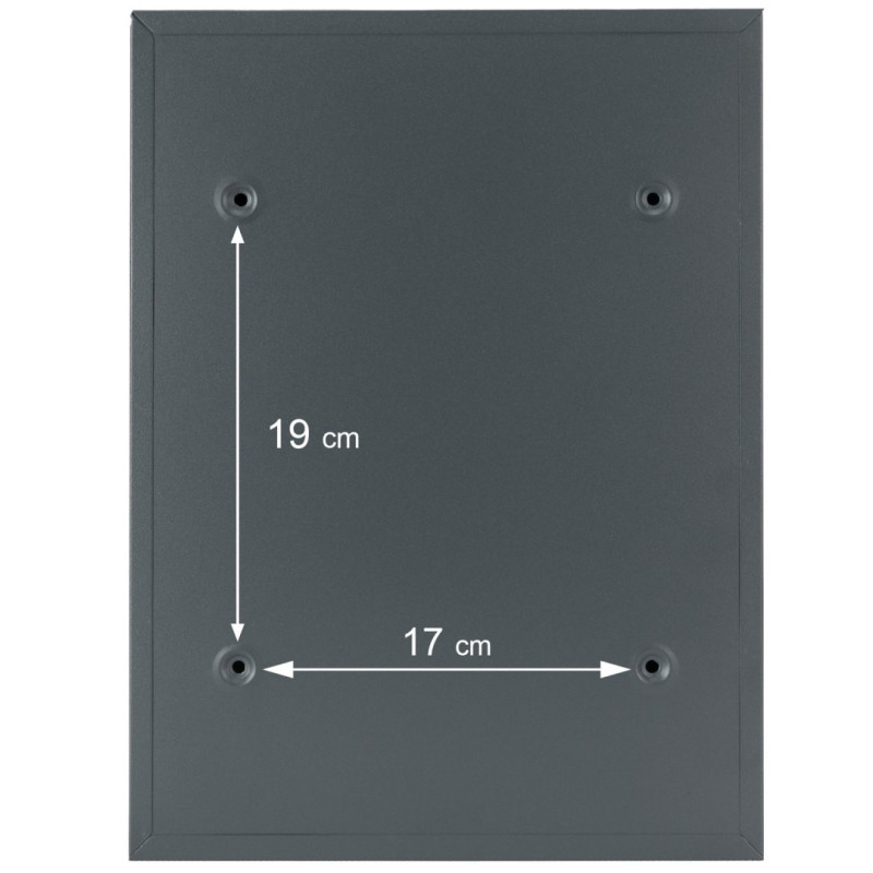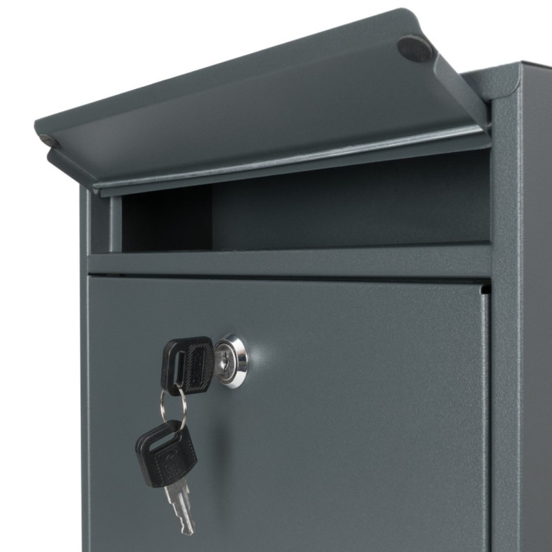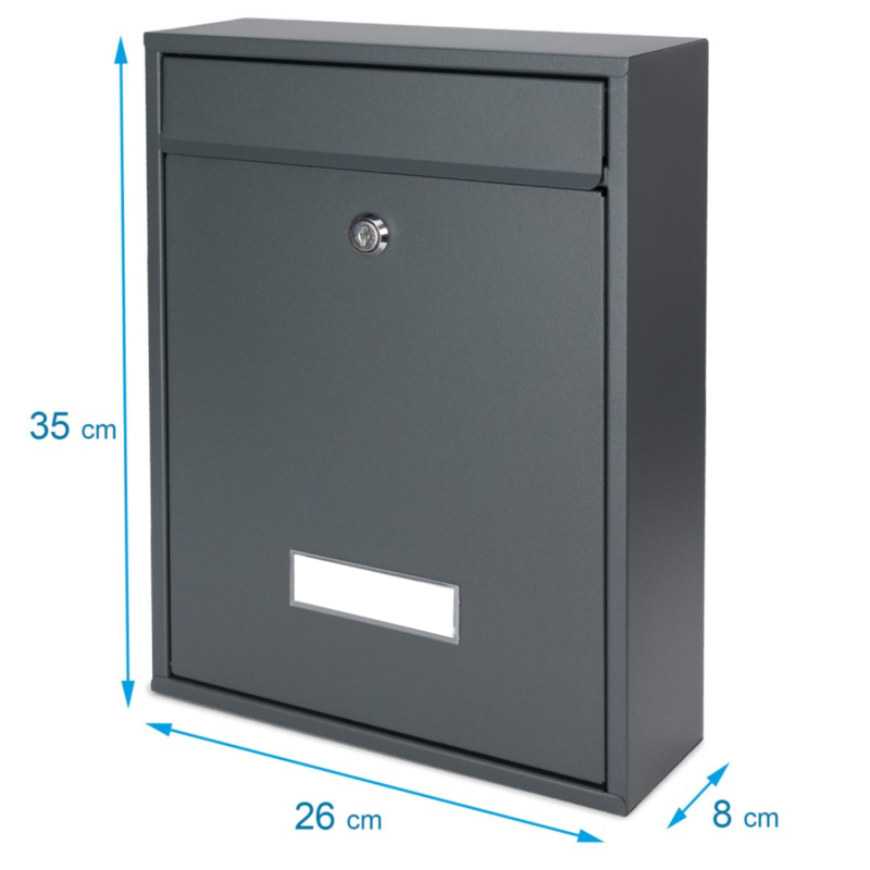 Obljubljena klasična poštna škatla iz jeklene pločevine, na voljo v dveh barvnih odtenkih. Njena pravokotna oblika omogoča enostavno montažo v razne konfiguracije. Odličen format za pridobivanje pošte v formatu A4. - Višina: 35 cm - Širina: 26 cm - Debelina: 8 cm - Material: pocinkana jeklena pločevina, prašno lakirana - Barva: ANTRACIT (RAL7016) - Priloženi sidrni vijaki s pritrdilnimi vijaki (4 kos) in dva ključa za zaklepanje. **Poštne nabiralnike montiramo / prosimo, preverite možnosti za montažo.**